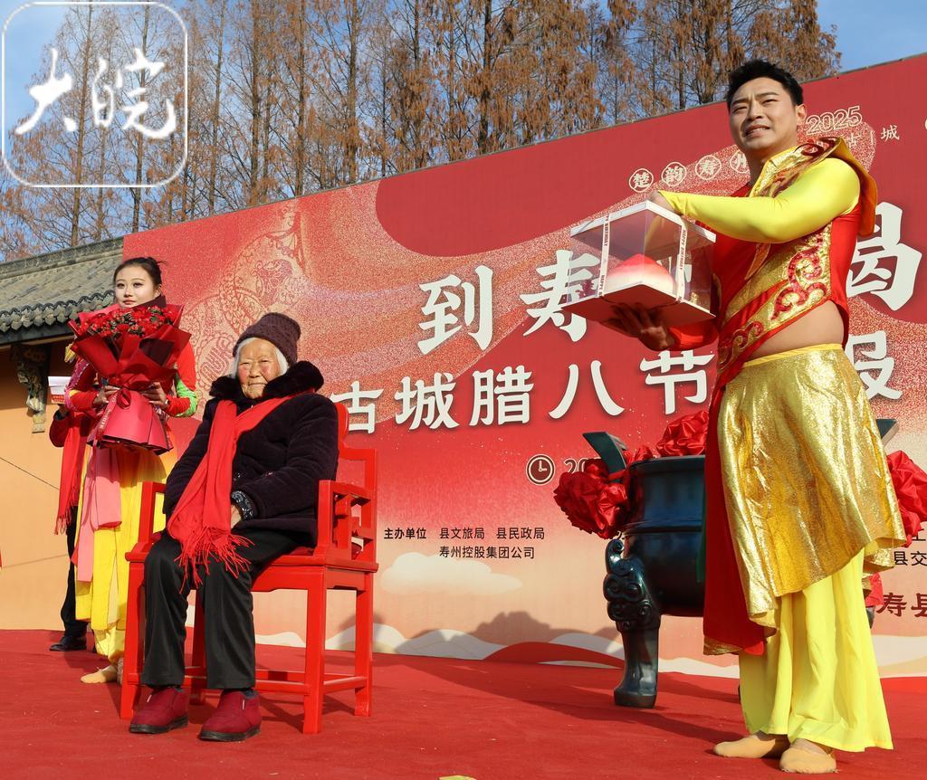 当天上午,在拥有1300年历史的报恩寺门前广场,大皖新闻记者看到114岁寿星王道英老人坐着轮椅来到活动现场,她戴着一条大红色围巾,显得格外喜庆。老人被请上台后,工作人员献上鲜花和寿桃,为老人贺寿。之后,在王道英老人的见证下,腊八粥起锅,第一碗寿州的腊八节“寿粥”也献给了王道英老人。之后,寿州控股集团将熬制的2000份腊八粥免费派发给当地群众。